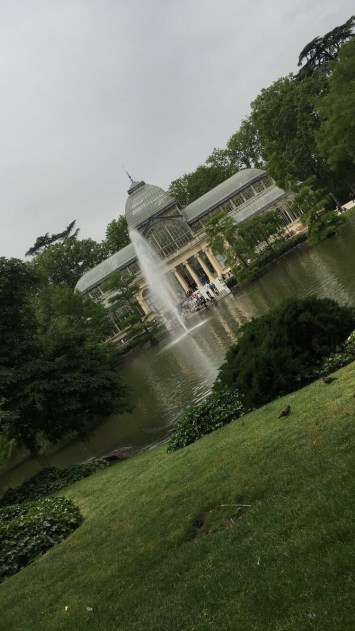Sunday (today) we slept in a little, and then went for a run to the Parque del Buen Retiro. It is a beautiful and large park in Madrid. They seemed to be setting up for some kind festival or event with booths, but I’m not sure and need to look into it. We walked around the park and saw the Palacio de Cristal. It looks like a giant bird cage, and there are bird chirps playing when you walk inside. We also saw a small museum in the park and decided to drop in. The exhibit was quite interesting. Giant pieces of cloth in different shapes, and one even had live people. Then we left the park, and stumbled upon a cafe for lunch. Now we are back in the apartment and are going to ask our host mom if she wants to go watch the Real Madrid and FC Barcelona game tonight!